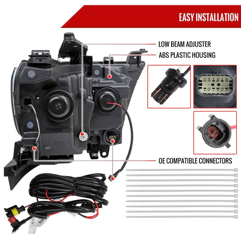 - Includes (1) pair of projector style headlights with switchback, sequential LED turn signal in chrome housing with clear lens