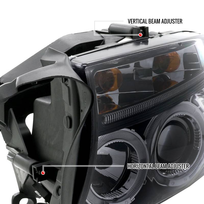 - Glossy black housing, smoke lens dual halo projector headlights with LED accent lights