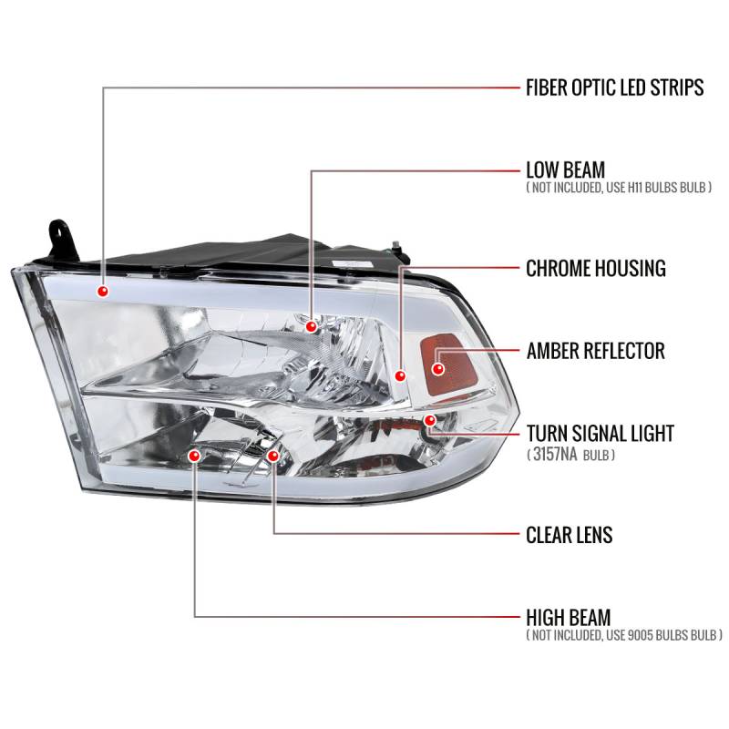 2009-2019 Dodge Ram 1500 2500 3500 Quad Style Headlights with LED Tube (Chrome Housing/Clear Lens)