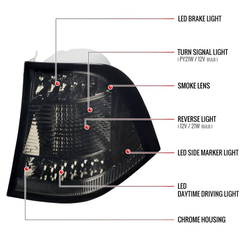 - Comes with 1 pair of chrome housing smoke lens LED tail lights