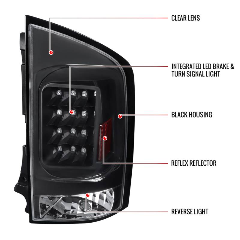 - Includes 1 pair of matte black housing, clear lens LED tail lights