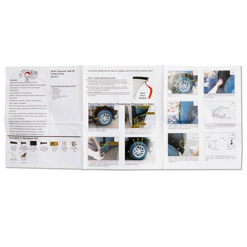 - Includes (1) set of Fender Flares (2x Front, 2x Rear), hardware, and installation instructions