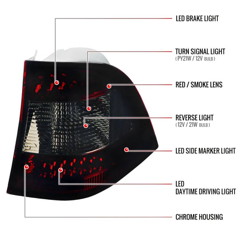 - Comes with 1 pair of chrome housing red/smoke lens LED tail lights