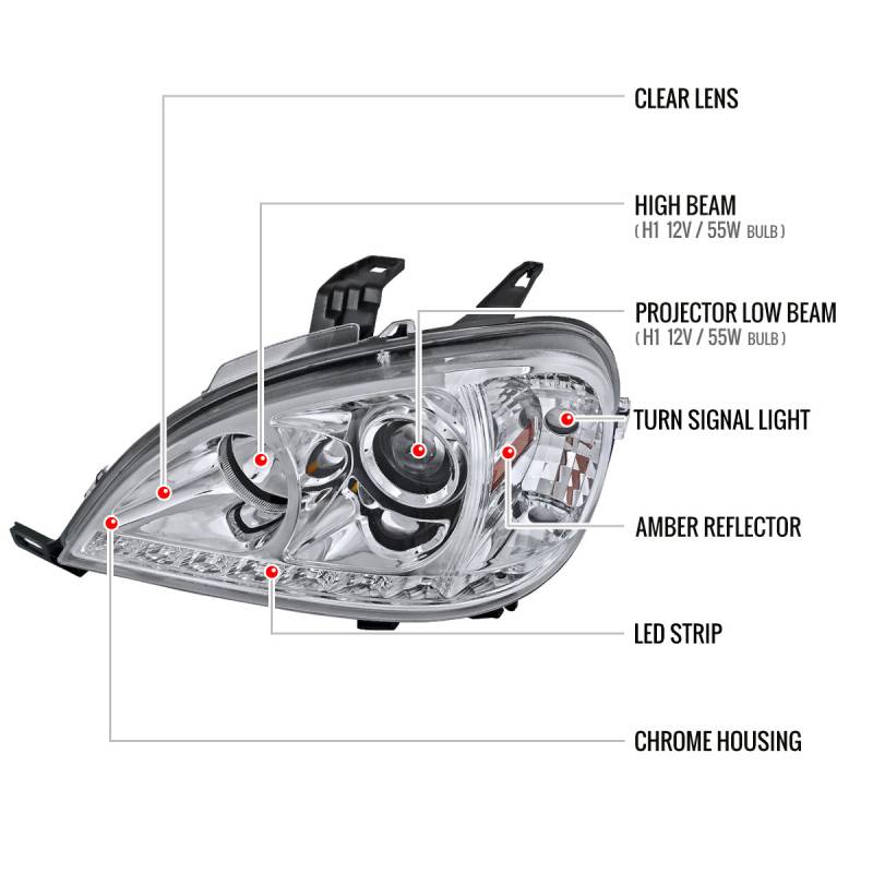 1998-2001 Mercedes Benz W163 ML Class Projector Headlights w/ SMD LED Light Strip (Chrome Housing/Clear Lens)