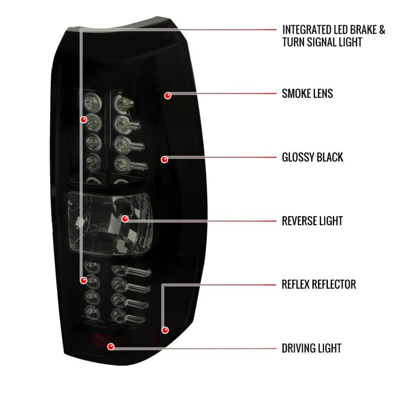 - Comes with 1 pair of glossy black housing smoke lens LED tail lights