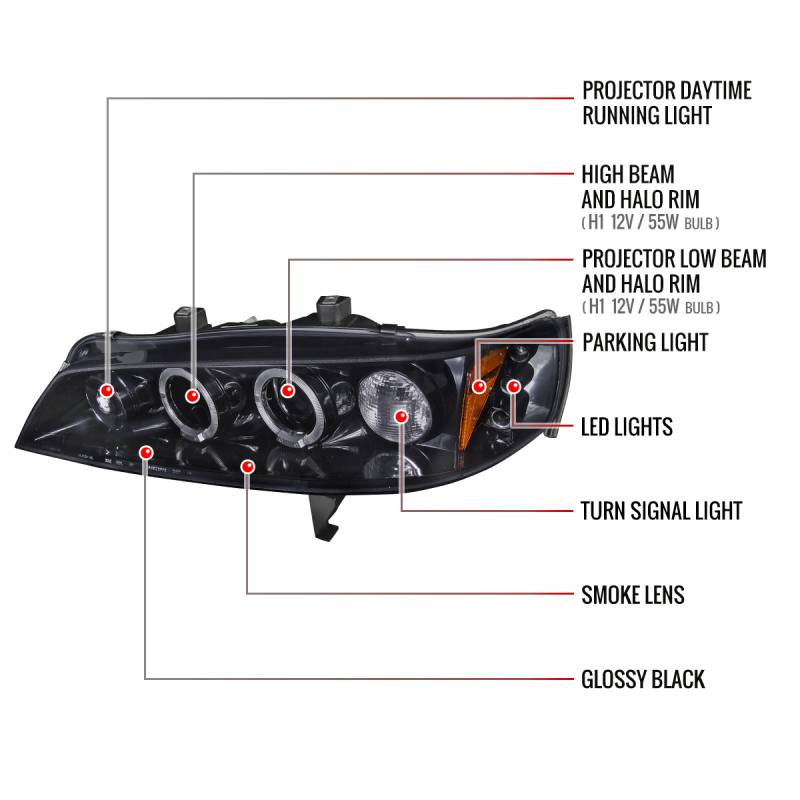 - Glossy black housing, smoke lens with dual halo & LED accent lights