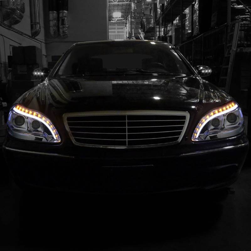1998-2006 Mercedes Benz W220 S Class LED Bar Projector Headlights w/ LED Turn Signal Lights (Chrome Housing/Clear Lens)