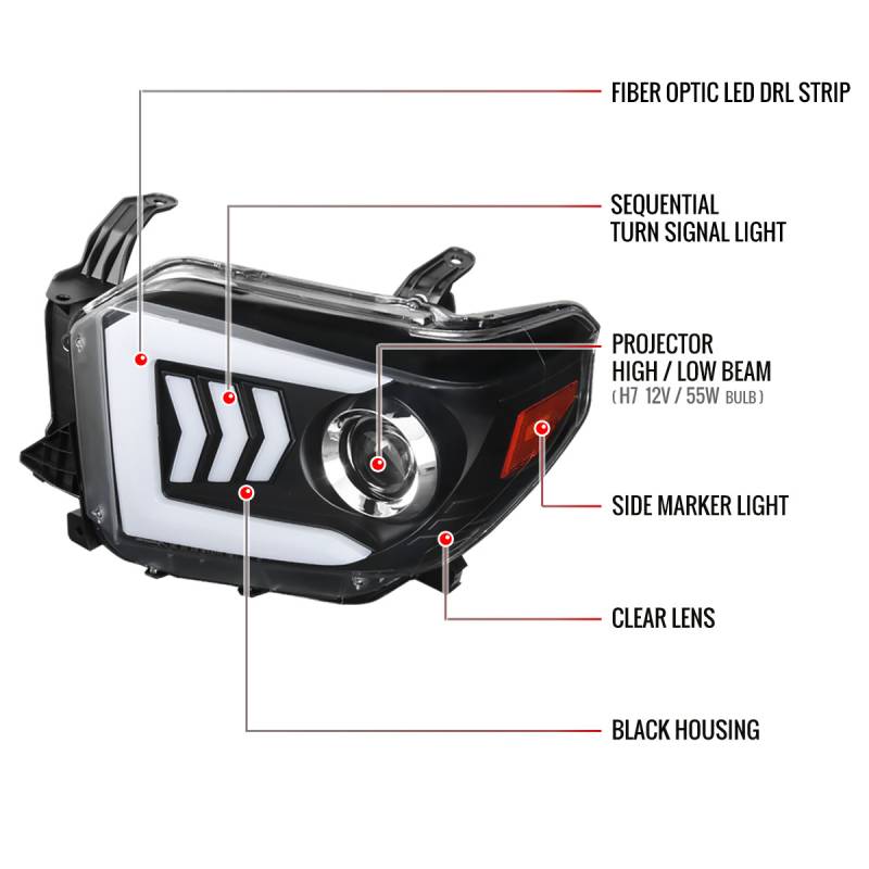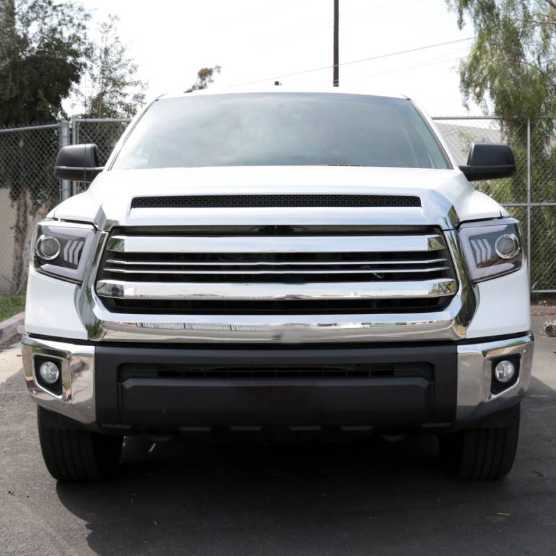 Upgrade your Toyota Tundra with Spec-D Tuning's projector headlights! These headlights are manufactured with the utmost quality standards and designed to be a direct replacement of factory headlights. Headlights come equipped with H7 bulbs for high/low beams and designed to be easily installed by reattaching the headlight harness from stock (plug-and-play application). Not only these headlights drastically improve the front look of your truck with the bright white LED C-bar and sequential arrow turn signal lights, it also improves the Tundra's lighting capabilities and visiblity on the road.