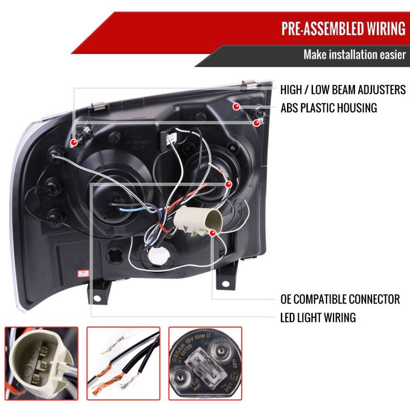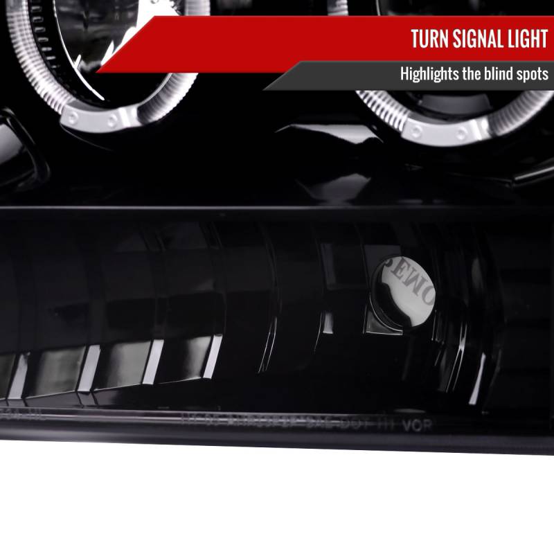 - Comes with one pair of jet black housing, clear lens dual halo projector headlights with LED accent lights (wiring required)