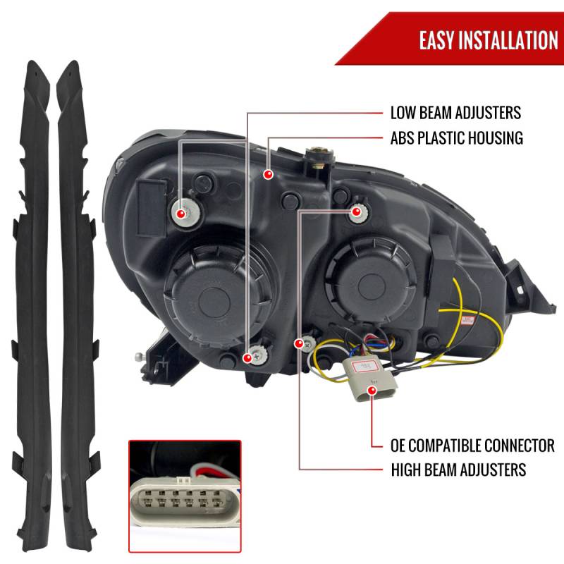 - Comes 1 pair of black housing clear lens projector headlights with LED light strip & LED turn signal lights
