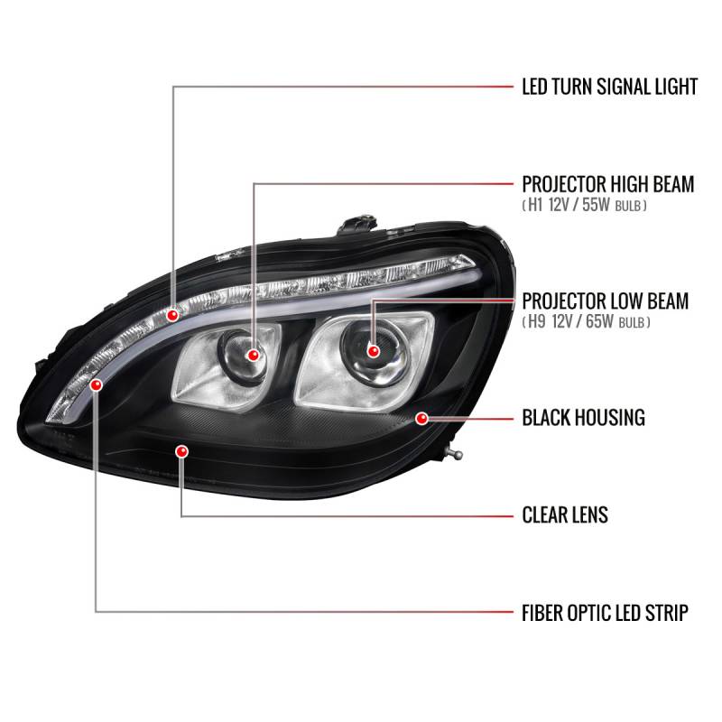 Spec-D 1998-2006 Mercedes Benz W220 S Class Projector Headlights w/ LED Light Strip & Turn Signal Lights (Matte Black Housing/Clear Lens)