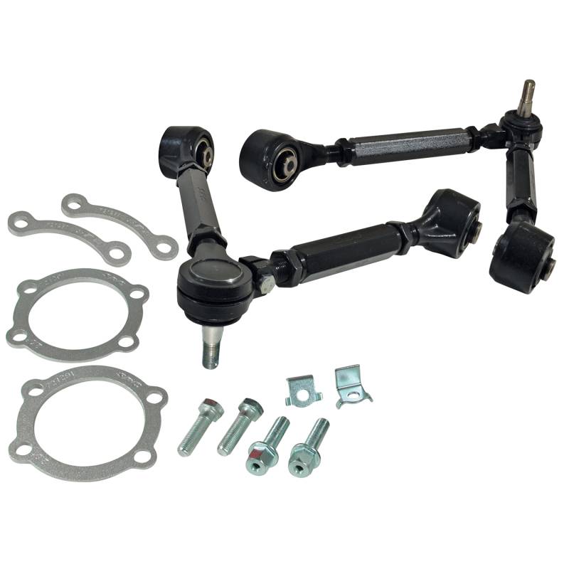 This pair of patent pending adjustable front upper control arms will give ±4° camber and ±4° caster change. SPC arms match the OE design for clearance so you can get up to +2° camber change without fender well interference. If more positive change is needed use the included +2° camber shims for fixed change and dial in the rest with your arms. The rubber isolated xAxis sealed flex joints retain OE bushing values (Noise, Vibration, and Harshness - NVH), while providing the handling qualities of a mono-ball. Optimized geometry and high strength forged steel components make this the strongest adjustable arm on the market today. Whether you want a cambered stance, improved handling, or to minimize tire wear, this is the best arm for you. US Patent # US 2016/0059652 A1