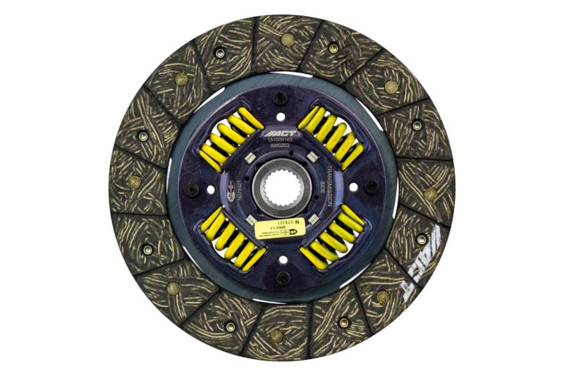 3000203 is a performance street disc and the most popular disc purchased. It features premium organic materials with high copper content for better heat transfer. Performance street discs allow for quicker shifting and smooth engagement. These discs feature a reduced marcel for faster shift action to complement ACT pressure plates. ACT spring-centered assemblies use bushings and cone springs similar to factory clutch discs. This creates frictional dampening, which improves clutch life and reduces noise. Quiet operation with increased strength and reliability.