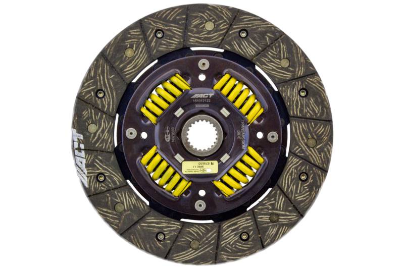 3000608 is a performance street disc and the most popular disc purchased. It features premium organic materials with high copper content for better heat transfer. Performance street discs allow for quicker shifting and smooth engagement. These discs feature a reduced marcel for faster shift action to complement ACT pressure plates. ACT spring-centered assemblies use bushings and cone springs similar to factory clutch discs. This creates frictional dampening, which improves clutch life and reduces noise. Quiet operation with increased strength and reliability.