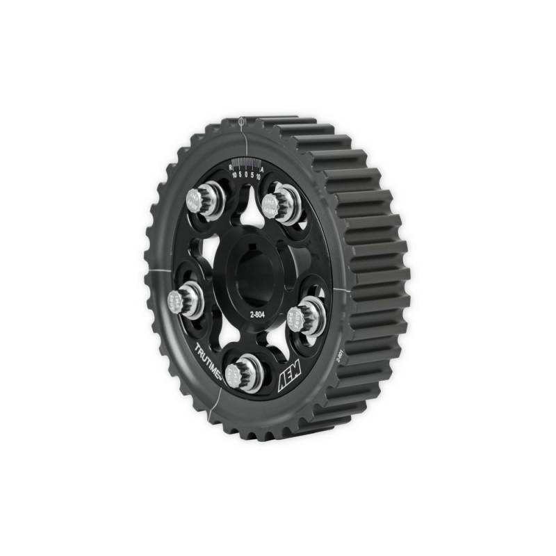 AEM Tru-Time Adjustable Camshaft Gears increase horsepower and torque without having to change the camshaft(s) and are must-have items for engines that are milled, forced induction, high compression and/or utilizing aftermarket competition cams. AEM Tru-Time cam gears enable users to match cam timing with their vehicle's tuning state by advancing or retarding the cam profile(s) in one-degree increments via true laser-etched markings. Precision-cut gear teeth ensure no premature wearing of the cam gear's belt surface and AEM's anodizing on the adjustable cam gear's teeth is lab-test proven as the hardest anodizing process on the market.