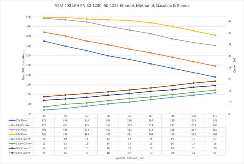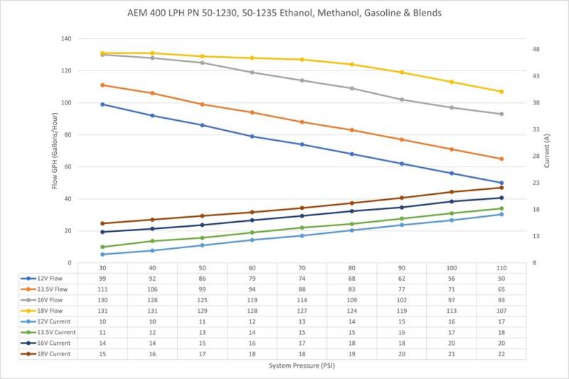 AEM's 400LPH high flow fuel pumps were designed with high performance naturally aspirated and forced induction EFI vehicles in mind! They deliver the same high flow and reliable performance that AEM has become known for at very competitive price. Each pump is individually flow tested and guaranteed to flow 400+ LPH (106 GPH) at 40 PSI (13.5V), which on gasoline will support 1000+ horsepower!* The pumps also maintain their high flowrate even as system pressure increases flowing 330+ LPH at 70 PSI (13.5V) which will support approx. 870 HP* on gasoline! Please see the flow curves and current draw vs. fuel pressure graphs on the specs tab for more information. With their compact 39mm body (same size as Walbro 255), low amperage draw, 11mm inlets and 9mm barbed outlet's these fuel pumps were designed to replace the OEM fuel pump in many applications. The 50-1230 features a double barbed outlet that is ideal for 3/8-inch ID hose where the 50-1235 features a smooth barbed outlet that is compatible with 5/16-inch ID hose. Each pump includes a wiring harness, pre filter, end cap and rubber buffer sleeve.
