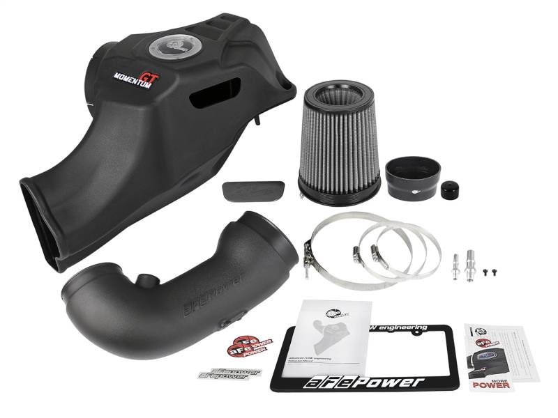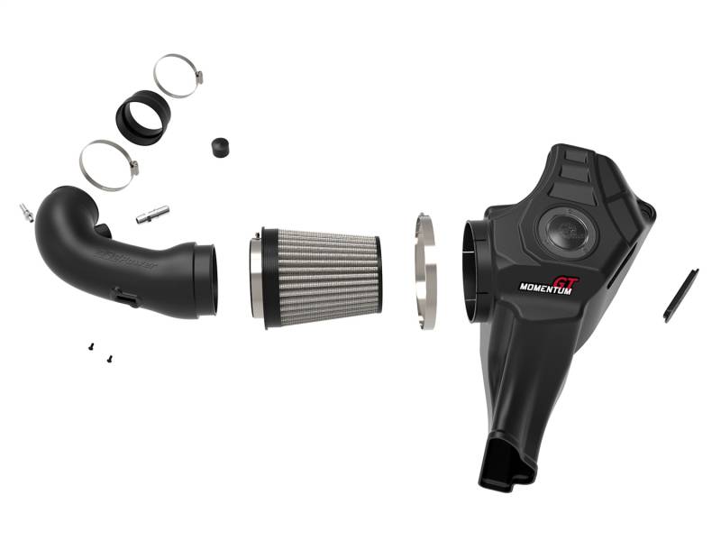 Large Three Layer Performance Air Filter:Momentum's unique filter-to-housing interface was built to feature the largest air filter possible. This 8" tall 360-degree radial flow air filter features our oil-free Pro DRY S media with three layers of synthetic media for maximum convenience. Its progressive layering provides great filtration efficiency and dust holding capacity, while not requiring the use of oils. This media is best suited for street use. Its inverted top makes for more filter surface area, resulting in longer service intervals.Unique One-Piece Housing:The one-piece sealed housing, constructed of heat-resistant cross-linked polyethylene (XLPE), draws styling cues from the Mustang's body. It incorporates the OE air inlet with no additional hardware and features an auxiliary air inlet that captures additional air from the inner fender. Its patented filter-to-housing interface design minimizes the total number of parts, making for an easy installation. A large, clear sight window allows for hassle-free filter inspection, without having to disassemble your system.Dyno-Tuned Intake Tube:This system features a high quality, computer-designed, dyno-tuned intake tube to achieve maximum power gains while maintaining a perfect fit. Its XLPE material is heat soak resistant and extremely durable.Premium Components:Momentum GT intakes are designed with fewer parts for a fast and easy installation. This is a direct fit intake system that utilizes factory mounting points and requires no cutting or modifications. Premium T-bolt clamps, couplings, and all other hardware is included.