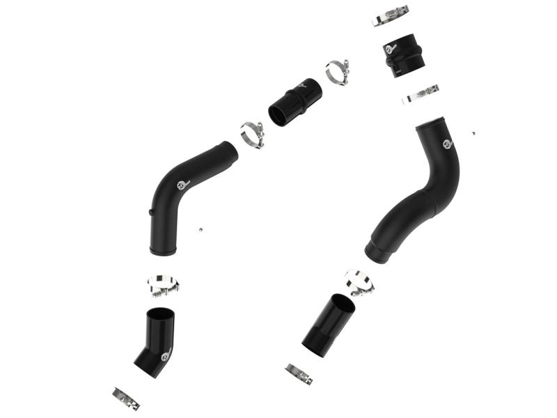 Smooth transitions in the mandrel-bent aluminum pipes decrease turbulence and minimize pressure loss, increasing horsepower and torque. This charge pipe kit provides a smooth transition between the turbo and the engine for lower operating temperatures and increased power. This kit includes high-quality, stainless-steel, spring-loaded T-Bolt clamps and heavy-duty, 5-ply, polyester reinforced silicone couplings for superior strength and durability. Finished in wrinkle black powder coating with a unique laser-etched aFe POWER logo for a custom look.