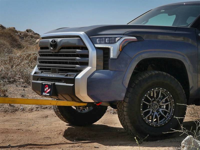 Add dedicated front recovery points to your Toyota Tundra. aFe POWER Tow Loops mount directly to the frame and are much safer than the factory tie-down loop when towing or recovering a stuck vehicle. The 3/4 IN solid steel loop is designed to safely withstand and distribute heavy loads allowing access to several recovery attachments for a strong and durable recovery point. Powder-coated red so they are easily recognized in the elements during off-road adventures. aFe POWER front tow hooks are constructed from 3/16 IN laser-cut, CNC machined steel brackets, and 3/4 IN solid steel bar. MIG welded for strength and durability. Bolts Directly onto the frame, using the front sway bar mounts with no drilling or modifications. Retains the front sway bar use while clearing the Active Aero front spoiler and factory bumper. (Patent Pending)