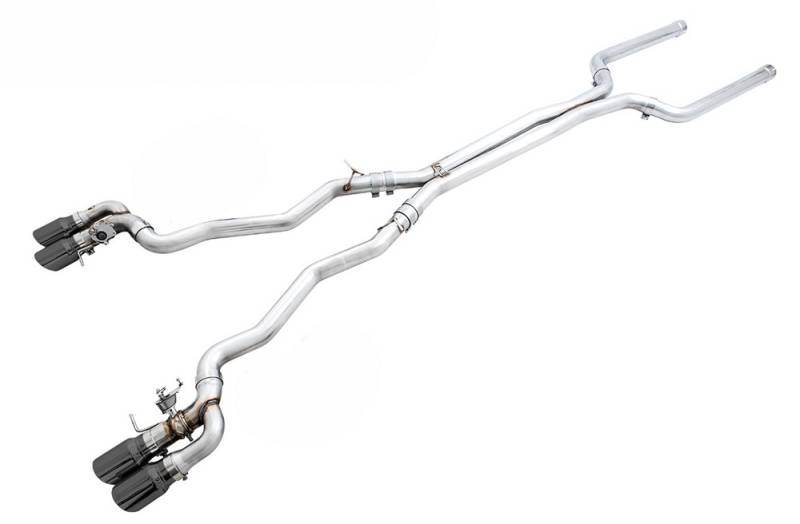 The SwitchPath Cat Back Exhaust features dual 3" CNC mandrel-bent .065" wall T304L stainless steel tubing from downpipes to tip outlets with a precision-engineered X-pipe in between. Equipped with valved rear sections, the SwitchPath Cat Back retains all of the M5's valve behavior when changing driving modes and/or using the exhaust button found on the console. The AWE Performance Mid Pipes replace the factory mid section with a 3" stainless steel X-pipe, and are included in the Cat Back SwitchPath configuration. All tip options are 4", slash-cut, and include the AWE logo and double-walling to ensure a mirror finish even under hard usage. All tips are individually adjustable, allowing depth into the bumper to be set according to personal taste.