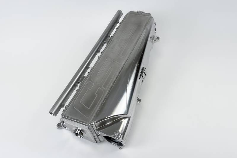 The Race X Manifold is designed for high level motorsports competition and racing applications. The limits of the current Super Manifold are very high and more than enough for many enthusiasts tuners and racers. However those looking to push their Gen 2 B58s to the maximum have been asking for more. Race X features a 25% larger core additional parameter ports and an optimized water flow system. The manifold can be used in either dual or single pass configurations and features a new front port that has been optimized for ice box setups. This is the most versatile and largest manifold available on the market and has been race tested on some of the fastest B58 powered drag cars in the world.; CSF incorporated a recessed design towards the back of the manifold that allows easy access to the spin-off oil filter. This means you do not have to remove your manifold every time you want to change your oil.; The inclusion of an air divider welded into the inlet side tank of the manifold is another exclusive feature of the CSF manifold. With the length of the manifold the engineers at VF Engineering wanted to make sure that the volume and velocity of air was consistent to all cylinders. The inlet has an air divider to ensure the best possible airflow and equal cooling performance to each cylinder. Airflow to the back of the manifold (cylinders four five and six) should be equal to the airflow to the front of the manifold (cylinders one two and three) for the best possible performance.; Two 1/8" NPT ports are located on the top of the back water plate. These ports can be used to measure inlet/outlet water temps as well as used as breather ports to help in the bleeding procedure. 1/8th NPT plugs come included in the supplied hardware kit. Please follow OEM BMW or Toyota bleeding procedure which takes roughly 15 minutes to complete.; Positioning the manifold in the engine bay is fairly straightforward. However it can be a little frustrating to get the bolt holes on the intake side mounting tabs lined up perfectly. After doing a few test fittings CSF realized this could be resolved by slotting the mounting tabs. This allows the bolts to be installed before final positioning adjustments and makes installation a bit easier.; Thermal Rejection Competition Spacer: Made from KIYLEX a patented revolutionary high-performance final stage polymer. KIYLEX is as strong as aluminum and can withstand temperatures up to 1100 deg F. This spacer is designed to insulate the intake manifold from conductive heat transfer from the cylinder head. This thermal barrier reduces manifold temperatures which helps lower Intake Air Temperatures (IATs) improve charge air cooler efficiency and combats heat soak. CSF is the exclusive distributor for the KIYLEX Intake Manifold Spacer for the B58 Motor.; The supplied hardware kit includes all of the brackets bolts washers and CNC machined fittings for installation. This is an industry-exclusive feature to the CSF x VF Engineering design and was extremely difficult to not only engineer but to manufacture as well. An array of items come vacuum packaged with corresponding letters listed on an easy to use Bill-of-Materials List (BOM) along with exploded diagrams and a simple order of operation procedure list to follow for installation. Made with mechanics technicians racers and DIY enthusiasts in mind. This is a Racing Product and intended to be installed only by a skilled and experience technician who is familiar with the B58 engine platform; The massive amount of research and development that went into the Super Manifold paid dividends when developing the Race X Manifold. That combined with all of the real world testing performed by race teams and tuners CSF had all the information needed to begin the process of designing this brand new manifold. The main goals when designing the new manifold were to increase air flow capacity and cooling capacity. Using Computational Fluid Dynamics (CFD) software CSF's team of engineers worked tirelessly on producing a manifold that would meet the demands of the most serious competitive drivers while offering the most features possible.; Once you get into that 1000hp+ range on the B58 most aftermarket manifolds have reached their limits in terms of flow and cooling capacity. To resolve both limitations CSF increased the size of the core by 25% over the #8200. The larger core has 15 cooling rows (vs 12 rows on the CSF #8200) and keeps up with the air flow demand while also increasing the cooling capacity.; CSF specifically designed the front water end plate of the manifold to allow for a single pass setup or ice box setup. This -16 ORB bung found on the front water plate is the largest available on any aftermarket B58 manifold (competitor's unit uses a -12 fitting). CSF has teamed up with industry leading fitting and hose experts Brown and Miller (BRMS) to optimize the water flow out of the front plate. CSF recommends using the following BRMS fittings with a maximum fitting angle of 120 degrees. BRMS: AC-16-M3-120 (Black) and BRMS: AC-16-M4-120 (Blue). BRMS is recommended by CSF because there are no flow restrictions on their fittings and are highly regarded as the best in the motorsport industry.; The CSF Manifold includes an extruded fuel rail which attaches to the outlet side of the manifold. The AN-8 fuel rail comes with a -8 internal hex plug fitting. This allows you to run a returnless fuel system or a full loop setup. A 1/8" NPT port on each cylinder runner can be used for nitrous or methanol injection. The CSF manifold allows for maximum spray control and even spray distribution throughout the engine.; CSF has included a port pad into the machining of the tank on the manifold inlet side. The ports can be used to measure additional parameters or as an additional vacuum source. The Race X Manifold has two additional 1/4" NPT ports to go along with the standard three 1/8" NPT ports. Each port can be plugged with the included hardware kit if they are