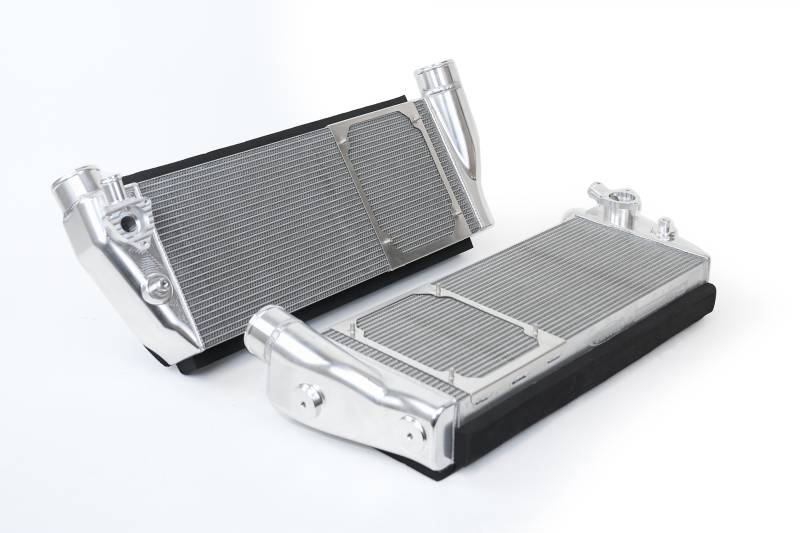 The CSF by PWR 488/F8 Twin Intercooler Set features Formula-1 grade cores which offer the greatest reduction in IATs and help eliminate heat soak. The Billet Aluminum construction offers the greatest strength and durability possible.