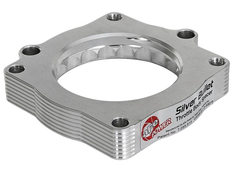 Silver Bullet throttle body spacers create turbulence in the air flow at the point just prior entry into the engine increasing horsepower, torque and improving throttle response and fuel efficiency. Silver Bullet throttle body spacers are constructed out of durable T-6061 billet aluminum and using a unique serrated/helix entry to create turbulence at the manifold while eliminating the annoying whistle found in other helix only throttle spacers.