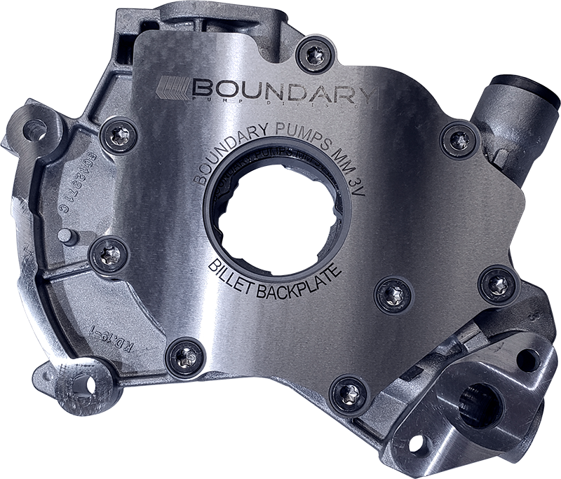 The Mod Motor oil pump from Boundary utilizes the Ford OEM 3V housing with a Boundary Steel back plate, which fits all the modular motors except the 6.2L.