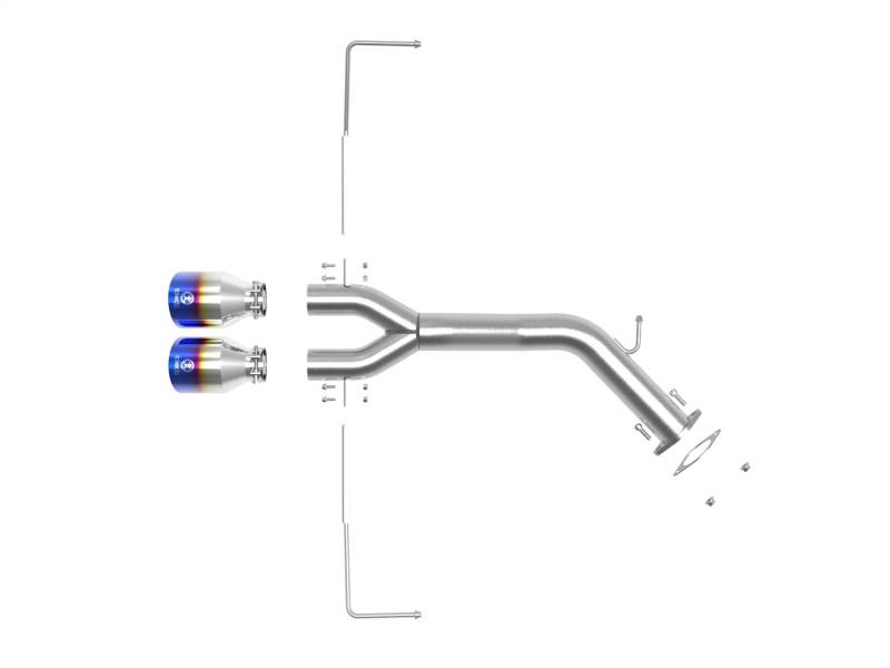 Performance Gains: This system produced gains of up to +8 HP and +8 lbs. x Ft. TQ., as measured on our in-house dyno. 3" - 2-1/2" 304 Stainless Steel Construction: This axle-back exhaust system is constructed of 3" - 2-1/2" mandrel-bent 304 stainless steel tubing for maximum strength and durability. Dual 4-1/2" Diameter Blue Flame Exhaust Tips: Finishing off this exhaust system are dual 4-1/2" diameter blue flame 304 stainless steel clamp-on exhaust tips. The tips feature a laser etched Takeda logo for a unique style. Throaty Sound: This system produces a throaty sound unleashing all available horsepower and torque. Installation: Utilizing a factory style flange and hangers this system is a direct bolt-on system, which requires no cutting or modifications for a hassle-free installation. Integrated Mitered Merge Collector: A mitered merge collector is used to decrease turbulence and increase exhaust velocity resulting in increased horsepower, torque and improved throttle response. Computer-Aided Design: Utilizing state-of-the-art computer-aided design technology, this exhaust system is designed for custom, high tolerance factory fitment. MIG-Welded: 100% MIG-Welded for race-proven strength and durability. Emissions Disclaimer: This product does not require a CARB EO#. aFe POWER exhaust systems are engineered and manufactured in our Corona, California facility.