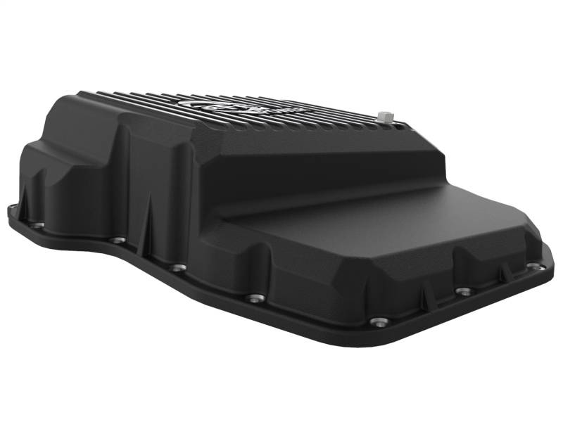aFe Power's new deep transmission pan brings performance engineering to the protection of your trucks transmission. This transmission pan has additional capacity for 2 more quarts over stock at the factory line and a magnetic drain plug to capture loos particles. Built-in internal and external fins transfer heat from the fluid to the outside air for maximum cooling. This transmission pan is constructed out of durable cast aluminum with reinforced ribs and a black powercoated finish with machined accents for maximum strength and styling.
