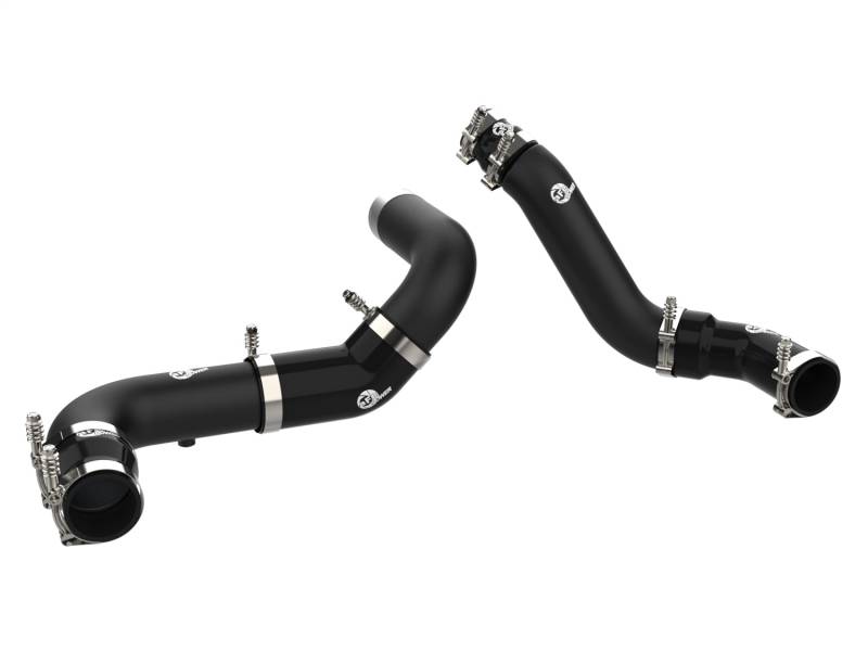 Smooth transitions in the mandrel-bent aluminum pipes decrease turbulence and minimize pressure loss, increasing horsepower and torque. This charge pipe kit provides a smooth transition between the turbo and the engine for lower operating temperatures and increased power. This kit includes high-quality, stainless-steel, spring-loaded T-bolt clamps and heavy-duty, 5-ply, polyester reinforced silicone couplings. This charge pipe kit also features factory style billet aluminum quick-connect adapter with an o-ring seal to ensure a leak-free fit while maintaining superior strength and durability. Finished in wrinkle black powder coating with a unique laser-etched aFe POWER logo for a custom look.