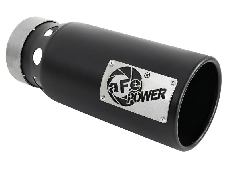 aFe Power is proud to introduce an all new intercooled exhaust tip. This tip comes with a black finish and is designed to fit 4" exhaust systems. With a 4" inlet x 5" outlet and 12" inch length, this single-walled, angle cut rolled tip comes with intercooling vents and a unique laser-cut aFe Power logo plate riveted on for an aggressive style. Intercooled Vents: This tip comes with intercooling vents designed to reduce exhaust gas temperatures at the tailpipe. Leak-Free Seal: A high quality stainless steel band clamp is used for a complete 360 degree sealing surface. aFe Badging: The exhaust tip comes with a unique laser-cut aFe Power logo plate riveted on for an aggressive style
