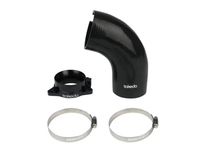 This turbo inlet is the perfect addition to the Takeda intake. It removes the air flow restriction of the factory turbo inlet and guarantees the maximum air flow to the turbo for maximum power. It provides a smooth transition for the air from the Takeda air intake tube to the turbo with the minimum restriction. Precisely CNC machined out of 6061-T6 billet aluminum, the adapter mounts directly onto the turbo and guides the increased air flow from the Takeda intake into the turbo. It is black anodized for durability and a stealthy appearance. This turbo inlet utilizes a flexible silicone coupling that is reinforced with three layers of polyester material, making it resistant to wear and deterioration. The silicone coupling mates directly to the aluminum turbo adapter and the Takeda air intake tube. All necessary clamps are provided. All necessary clamps and hardware are provided for a fast and easy installation. The factory harness bracket mounts directly onto the aluminum adapter for perfect fitment. This item will only fit with Takeda air intake systems P/N: 56-10021D , 56-10021R, 56-70021D and 56-70021R . It will NOT fit with the factory air intake system. For use with factory air intake system, see part number 59-20001.