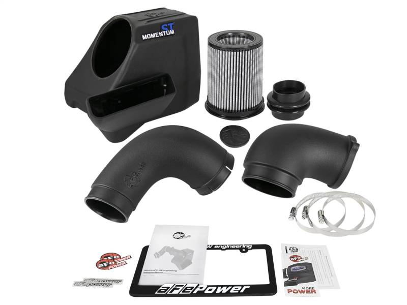 Unique One-Piece Sealed Housing: The smooth one-piece sealed housing with auxiliary air scoop is used to eliminate the use of multiple-piece housings and ensure the coldest air intake charge available. A urethane plug is also included if you wish to completely seal the auxiliary air scoop. High Quality Tube: This system uses a high quality plastic CAD designed, dyno-tuned, roto-molded intake tube to achieve maximum power gains while maintaining a perfect fit. Large 3-Layer Performance Air Filter: This Momentum ST intake system was designed around the largest filter possible to allow maximum performance and filtration. This cone filter has a massive round flange and is 8" tall Pro DRY S filter media. The Pro DRY S performance air filter features 3-layers of progressive finer porosity synthetic media providing maximum convenience with 100% polyurethane frame for long life and multiple cleaning cycles. Premium Hardware: Premium stainless steel clamps and a silicone coupler at the throttle body is used for strength and durability whi le also providing the most secure installation available. Momentum ST intakes are designed with fewer parts for a quick and simple installation.