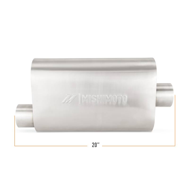 How much you enjoy driving your car or truck is directly proportional to how good it sounds. No matter how much power it makes or how well the chassis is sorted a well-designed exhaust can mean the difference between an exciting drive and a dull commute. At Mishimoto we offer a variety of components to make your exhaust suit your vehicle and your taste from pipes to V-bands and now resonators and mufflers.----Our universal stainless-steel mufflers are designed to bring your exhaust to life without blowing out your eardrums. The perforated fiberglass-packed straight-through core takes some of the volume out of your exhaust while still letting your engine growl and breathe freely. The brushed stainless-steel body and precision TIG welds add a sleek look to your exhaust and withstand even the harshest environments. Our mufflers are available with 2.5-inch ID center inlet/outlets or 3-inch ID offset inlet/outlets to easily fit your vehicle's layout. Like all Mishimoto exhaust parts these mufflers are backed by our Mishimoto Lifetime Warranty to ensure your car or truck sounds its best for a lifetime to come