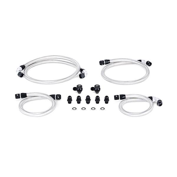 TechSpec PurchaseIncludes: 2ft, 4in Stainless Steel Braided Hose with 90 Degree -10AN Fittings--4ft, 8in Stainless Steel Braided Hose with 90 Degree -10AN Fittings--3ft, 4in Stainless Steel Braided Hose with 45 Degree and Straight -10AN Fittings--2ft, 2in Stainless Steel Braided Hose with 90 Degree and Straight -10AN Fittings--M18 x -10AN Fittings w/ Dowty Oil Seals--M18 x -10AN Banjo Bolts w/ Dowty Oil Seals--10AN - 10AN Male Connector--Mishimoto Lifetime Warranty